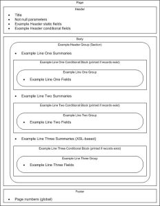• There is only one template for this printed report, with XSL conditionality to include or exclude regions or columns